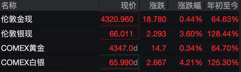 12月17日,白银市场迎来历史性时刻。现货白银价格接连突破65美元/盎司和66美元/盎司两道关口,再创历史新高,截至发稿报66.01美元/盎司,涨3.6%。COMEX白银期货一度大涨超5%,峰值最高达66.5美元/盎司,截至发稿报65.99美元/盎司,涨4.21%。